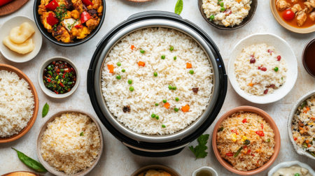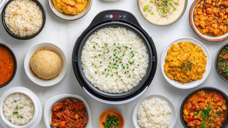 A creative flat lay of a rice cooker with a variety of cooked rice dishes arranged around it, including rice pilaf, fried rice, and rice pudding.