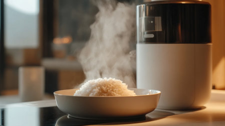 A stylish rice cooker with steam rising, sitting on a neat kitchen countertop next to a bowl of freshly cooked rice.