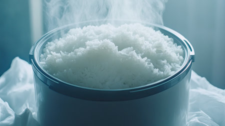 A detailed shot of a rice cooker lid lifted, revealing perfectly cooked hot rice with steam escaping, showcasing the texture and fluffiness.
