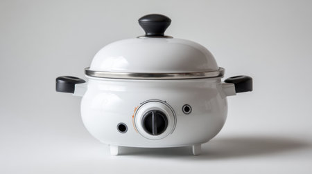 A sleek and modern slow cooker featuring a white body and black details. Ideal for convenient meal preparation, this kitchen appliance elevates home cooking with ease.