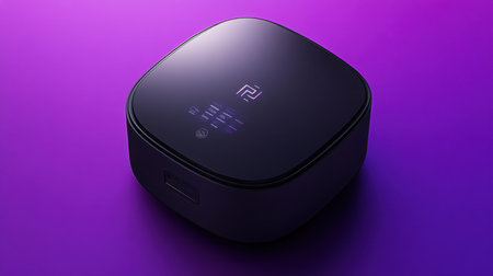 A modern and sleek device showcased on a vibrant purple background, emphasizing contemporary design and technological innovation in a minimalist style. Perfect for tech enthusiasts.