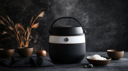 A sleek black and white rice cooker emits steam, nestled among elegant tableware and decorative grasses. This composition reflects modern culinary art and contemporary kitchen aesthetics.
