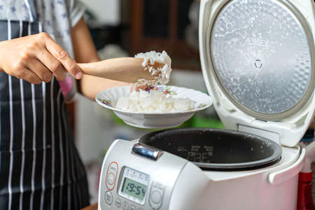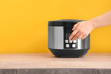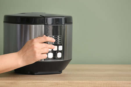 Female hand pushing on the button of the new modern rice cooker in the kitchen preparing the cook for family, new machine electronic technology concept.
