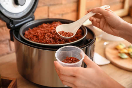 Cooking rice in a rice cooker. The woman measures out a cup of rice and pours it into a cup.