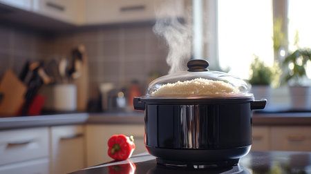 A sleek black pot with steaming rice sits on a kitchen counter, surrounded by natural light, evoking a warm and inviting cooking atmosphere.
