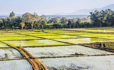 Beautiful Southeast Asian rice paddies with water reflections, layered fields, no people