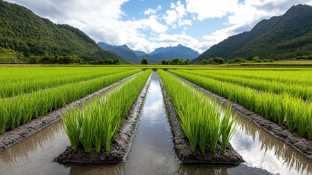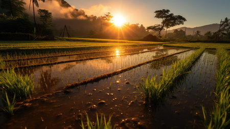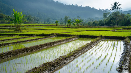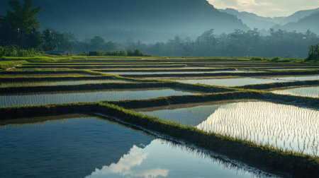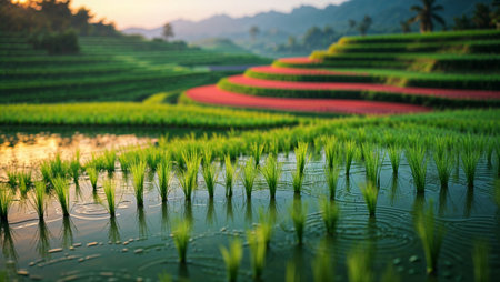 Lush green rice shoots covered in morning dew drops in a terraced paddy field. golden sunlight illuminates the scene with mountains in the background, reflecting in the water.