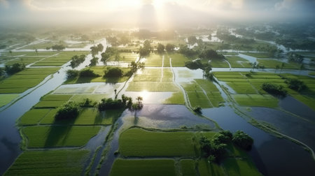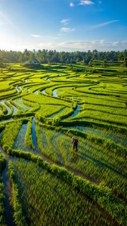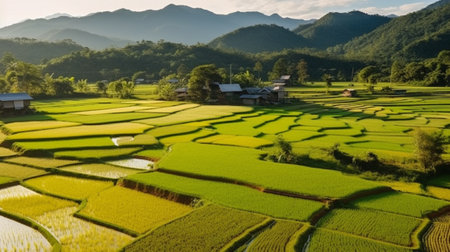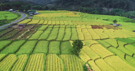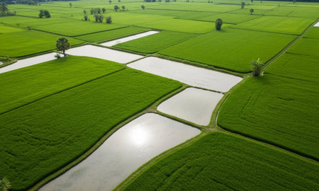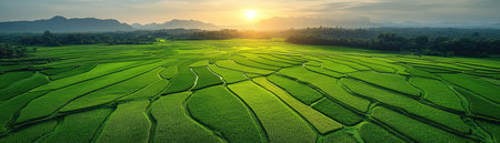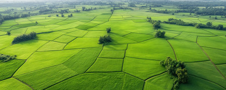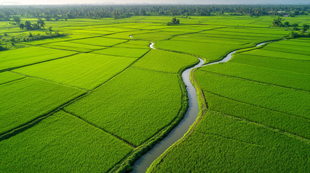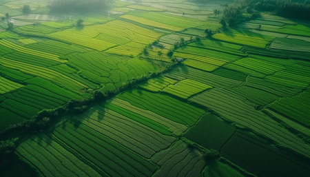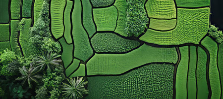 Aerial view captures the vibrant green rice paddies, forming mesmerizing patterns across the landscape, showcasing the beauty of sustainable agriculture