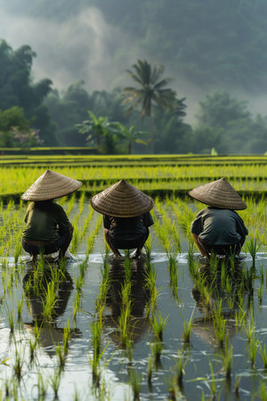 Three farmers in traditional hats bend over to tend rice paddies, highlighting agricultural life and cultivation