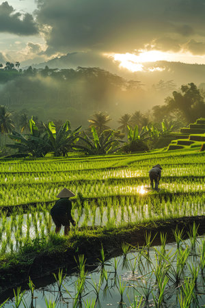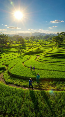 Aerial view of lush green terraced rice fields with farmers working under the golden sunset, creating a serene and idyllic rural landscape.