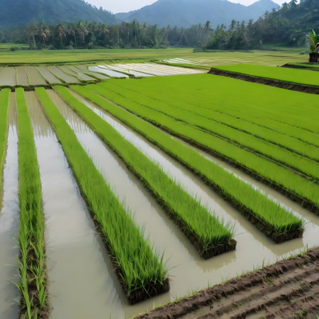 A wide shot of a flooded rice paddy field with rows of green rice plants, surrounded by palm trees in the background