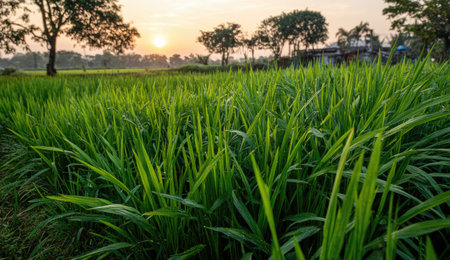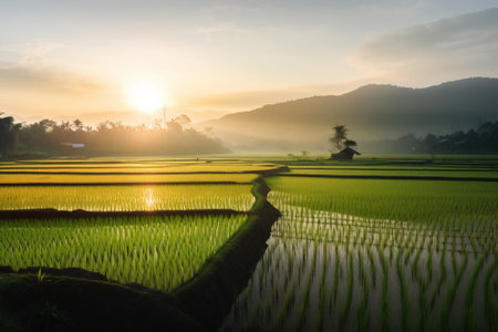 Rice field in the morning sun. Farming with natural ecological vegetables. Healthy useful products. AI generated.