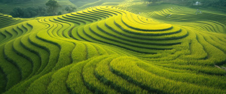A breathtaking view of vibrant green terraced rice fields cascades across the landscape, creating a mesmerizing pattern. The undulating hills, bathed in golden sunlight, evoke a sense of tranquility and harmony with nature.