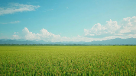 A vibrant rice field stretches under a clear blue sky, with mountains in the background. This serene landscape captures the beauty of nature and agriculture.