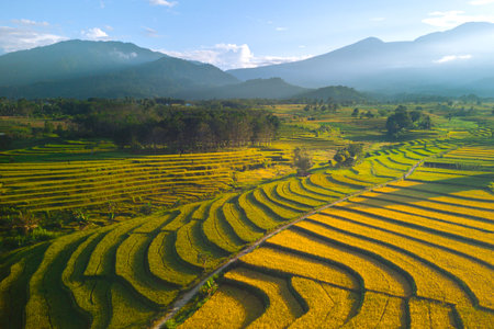 Aerial view captures the vibrant beauty of rice paddies in Indonesia, showcasing a mesmerizing tapestry of green and gold hues, reflecting different stages of rice growth. Rural nature background