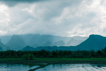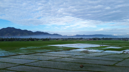 The expanse of green rice in the rice fields under the hill in the morning in Yogyakarta, Indonesia, the atmosphere is very calm, peaceful and warm