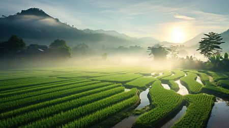 Serene rice terraces bask in gentle morning light, surrounded by lush greenery and misty mountains, illustrating the harmony of nature and agriculture.