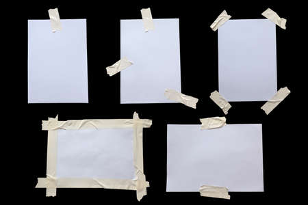 Variety of white paper stuck with sticky tape isolated on a white background.