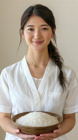 Smiling Young Woman in White Holding a Bowl of Fresh Cooked Rice on Neutral Background AI Generative