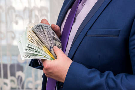 Concept for corruption, bankruptcy, bail, crime, bribing, fraud, auction bidding Bundle of dollar cash in hand