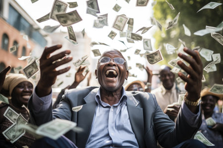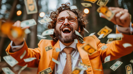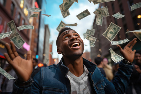 Happy person getting bonus money and banknotes flying in the air and get lucky rich and financial freedom comeliness