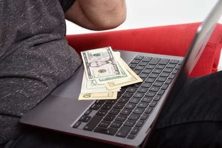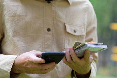 A man in a blue jumper holds money in his hands, a stack of 100 dollars blurred and close-up of money 100 dollars 200 dollars.Money concept