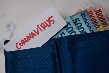 Rupiah Banknotes and Coronavirus text on blue wallet