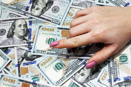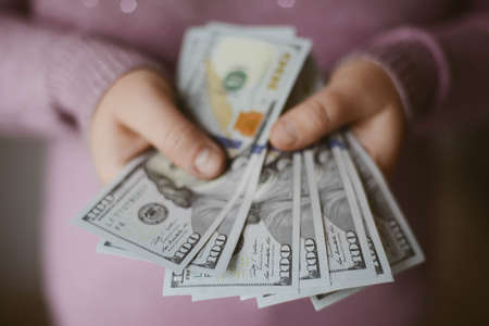 Business woman counting money in hands. Handful of money. Offering money. Women's hands hold money denominations of 100 dollars. Cash out money. Credit concept.