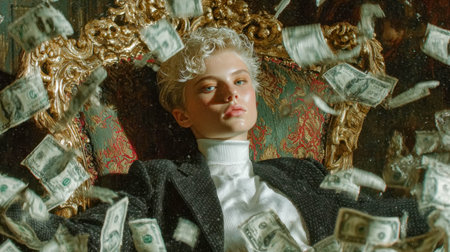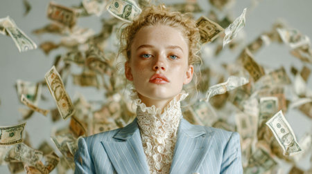 Confident young woman in vintage attire surrounded by flying dollar bills, symbolizing wealth, independence, and luxury.