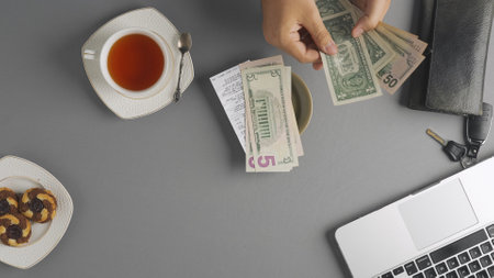 Top view of man hand paying bill at cafe or restaurant with cash, takes money banknotes from the wallet puts on the plate with receipt.