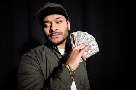 stylish indian hip hop singer in cap holding dollar banknotes isolated on black