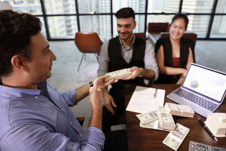 Caucasian business man and asian business woman received money after sign contract from customer. He showing thumb up meaning of like or success.