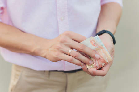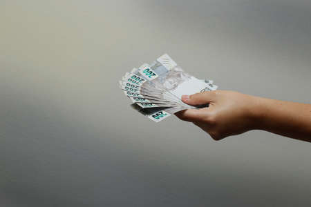 Hands holding Brazilian real notes, Brazil BRL banknote, Brazilian currency, economy and business.