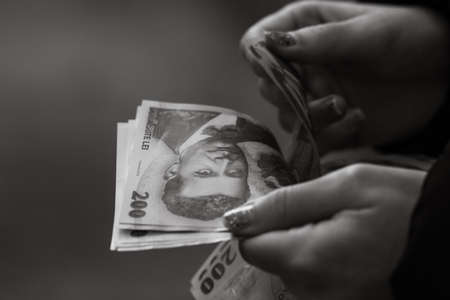 Selective focus on detail of LEI banknotes. Counting or giving Romanian LEI banknotes. World money concept, inflation and economy concept