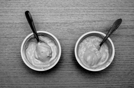 Natural white yogurt on the table. Healthy snack, Greek yogurt.