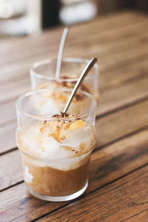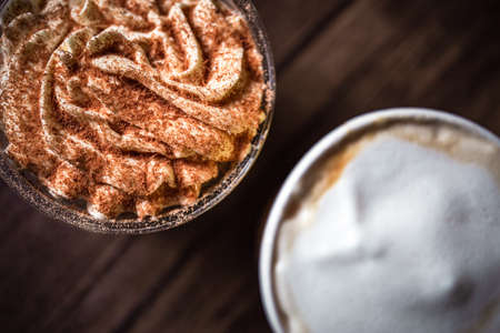 Glass of coffee latte with whipped sour cream, caramel popcorn, cinnamon and chocolate