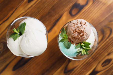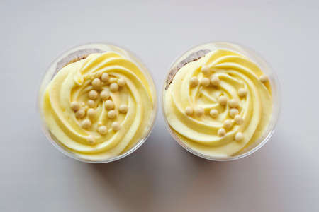 Two delicate sweet desserts made of sponge dough and custard. Delicious desserts in transparent glasses of British cuisine. Close-up. Top view. Copy space. Selective focus.