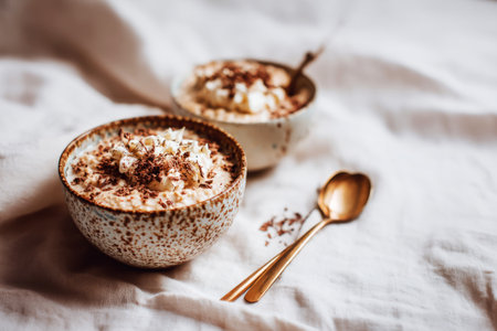 Enjoy a comforting breakfast bowl featuring creamy oatmeal topped with banana slices, chocolate shavings, and a sprinkle of spice. Perfect for a relaxed morning