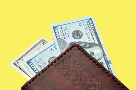 Brown leather wallet with money on a gray background. Ukrainian hryvnias are peeking out of an open wallet.