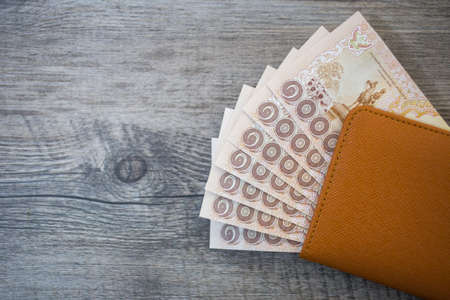 Indian five hundred (500) rupee cash note in brown color wallet leather purse on a wooden table. Business finance economy concept. High angel view with copy space room for text on front side of image