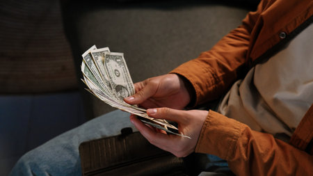 Young man spending evening at home sitting on sofa in living room, holding fan of money cash bills, close shot of hands with banknotes.