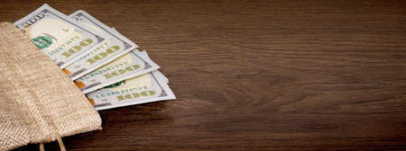 Dollars in a canvas bag on a dark wooden background. Copy space