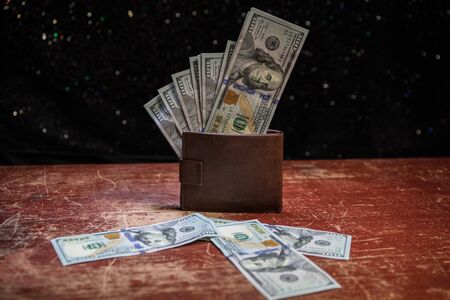 Stylish men's purse with money on wood background. men's purse with money, credit and debit cards on the wooden table