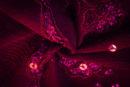 Silk red. The fabric is embellished with sequins. background, silk satin, luxurious texture, dark fabric, costume cotton material, abstract color image pattern, delicate liquid emerald velvet