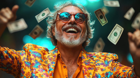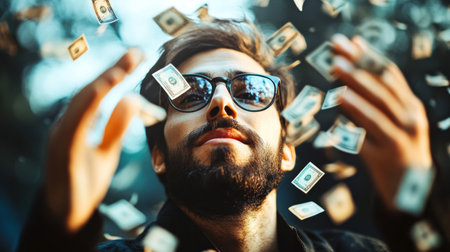 A man wearing sunglasses enjoying a moment surrounded by falling dollar bills, symbolizing wealth, success, and financial freedom with an outdoors setting.