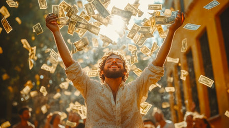 Happy man throws dollar bills in the air, celebrating wealth and financial success in a sunlit outdoor scene.