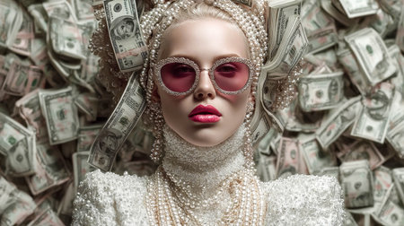 Stylish woman in sunglasses and headscarf made of dollar bills, wearing pearls and gold jewelry.