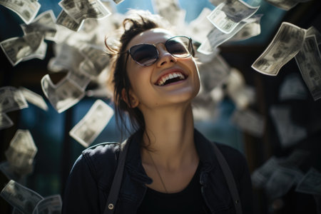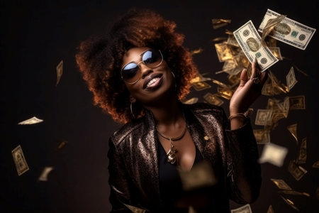 Confident young woman in vintage attire surrounded by flying dollar bills, symbolizing wealth, independence, and luxury.