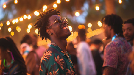 A smiling man in a festive hat looks up in wonder, surrounded by colorful bokeh lights and confetti.
