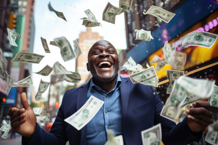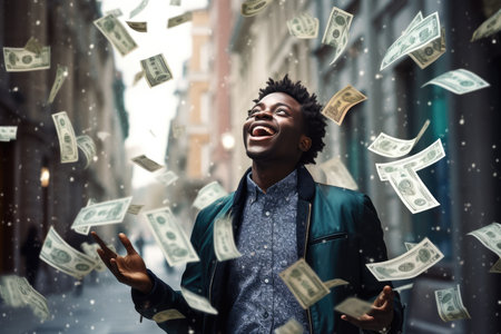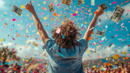 Happy person getting bonus money and banknotes flying in the air and get lucky rich and financial freedom comeliness